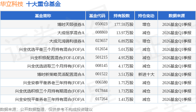 持有华立科技最多的基金为博时天颐债券A,目前规模为5.57亿元,最新净值1.7925(4月28日),较上一交易日下跌0.42%,近一年上涨15.51%。该基金现任基金经理为李重阳 罗霄。